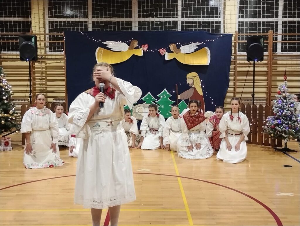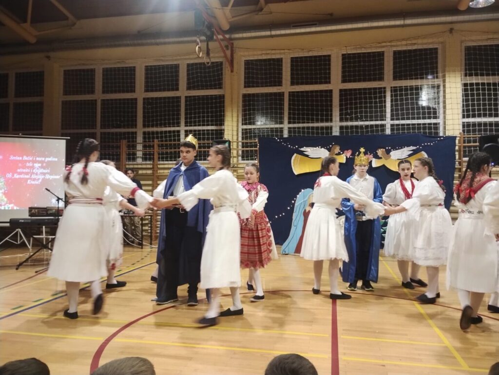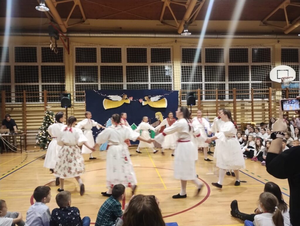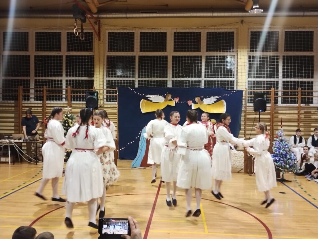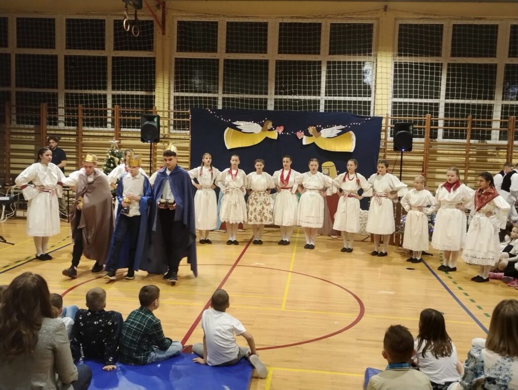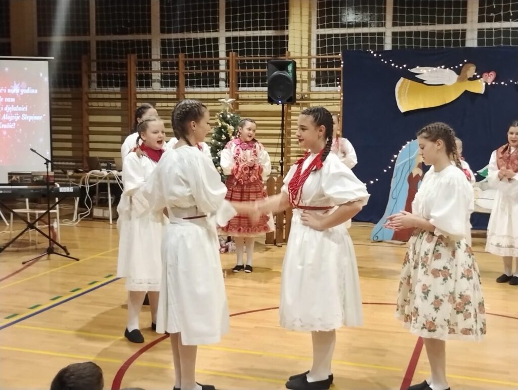 U priredbu su utkali sve ono što božićno vrijeme čini najljepšim i najradosnijim dijelom godine – tradiciju, zajedništvo, veselje, glazbu, ples i pjesmu. Ovogodišnji je program bio posebno bogat i raznovrstan te smo ponosni na sve naše učenike koji su vrijedno radili i uvježbavali svoje recitacije, igrokaze, instrumentalne izvedbe, plesove i pjesme te nam svojim izvrsnim nastupima prenijeli obilje božićnog veselja. Svečanu je večer posebno upotpunio nastup Folklorne skupine, koja u našoj školi ponovno djeluje nakon gotovo dva desetljeća. Učenice Folklorne uz puno su truda, kroz stare narodne plesove, pjesmu i igru, predstavile prekrasne narodne nošnje i običaje našega kraja.