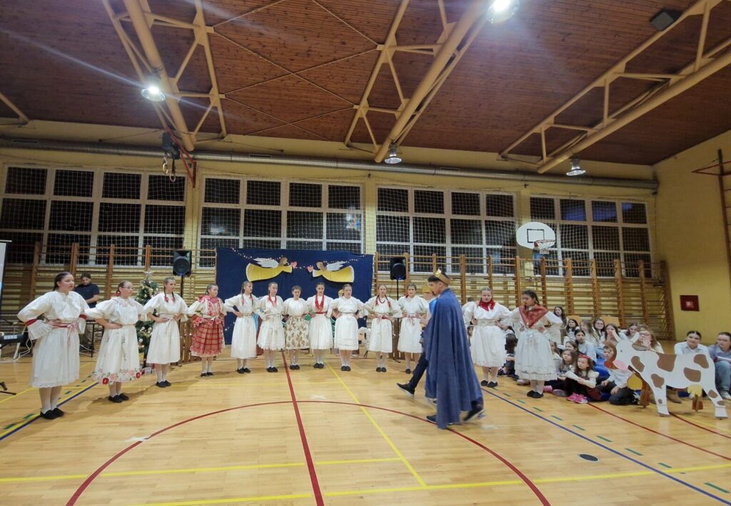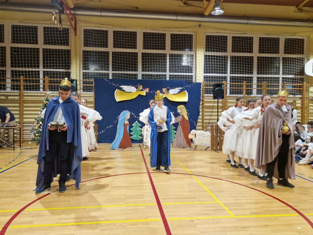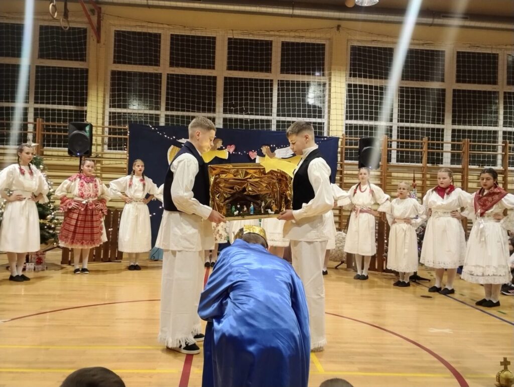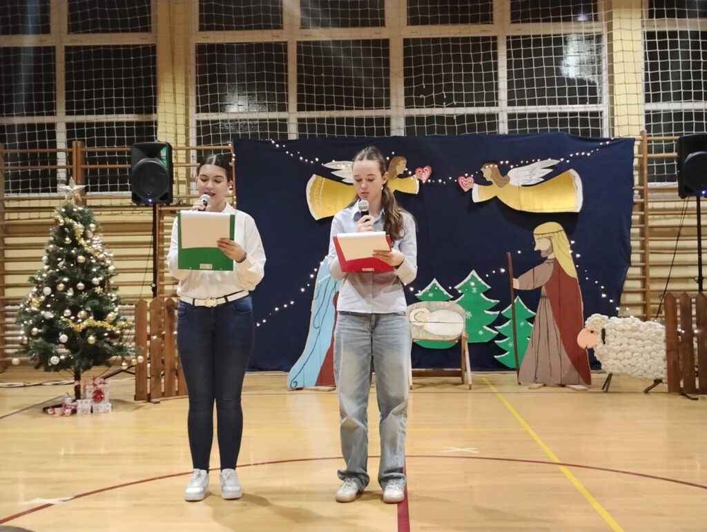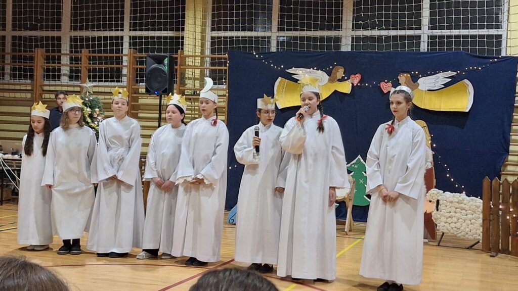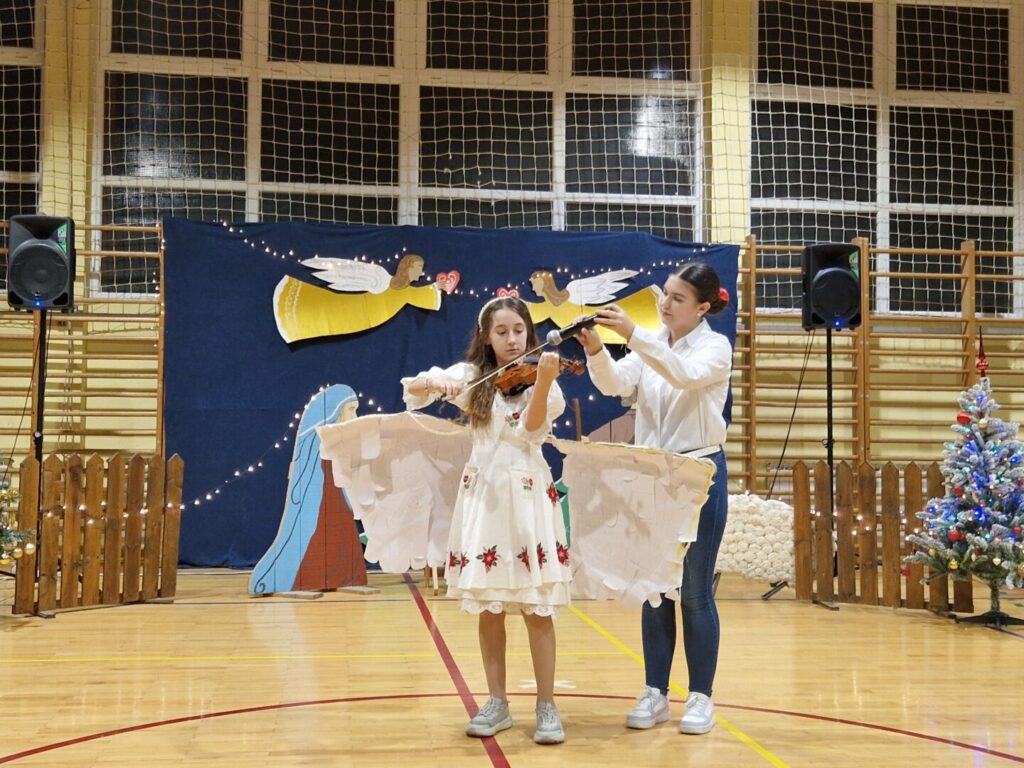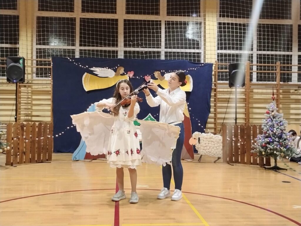 U priredbu su utkali sve ono što božićno vrijeme čini najljepšim i najradosnijim dijelom godine – tradiciju, zajedništvo, veselje, glazbu, ples i pjesmu. Ovogodišnji je program bio posebno bogat i raznovrstan te smo ponosni na sve naše učenike koji su vrijedno radili i uvježbavali svoje recitacije, igrokaze, instrumentalne izvedbe, plesove i pjesme te nam svojim izvrsnim nastupima prenijeli obilje božićnog veselja. Svečanu je večer posebno upotpunio nastup Folklorne skupine, koja u našoj školi ponovno djeluje nakon gotovo dva desetljeća. Učenice Folklorne uz puno su truda, kroz stare narodne plesove, pjesmu i igru, predstavile prekrasne narodne nošnje i običaje našega kraja.
