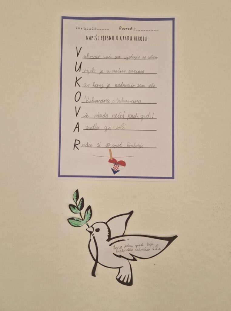 Učenici su izradili i akrostih posvećen Vukovaru, u kojem su kroz početna slova riječi izrazili svoje osjećaje, misli i zahvalnost prema Gradu heroju. Također su slikali simbole mira i grada Vukovara, poput vodotornja, bijele golubice i križa, pokazujući na kreativan način razumijevanje i suosjećanje.