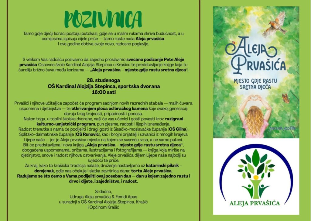 Pozivamo vas na svečanu manifestaciju podizanja pete krašićke Aleje prvašića – mjesta koje simbolizira početak školskog puta, rast i zajedništvo naše djece.